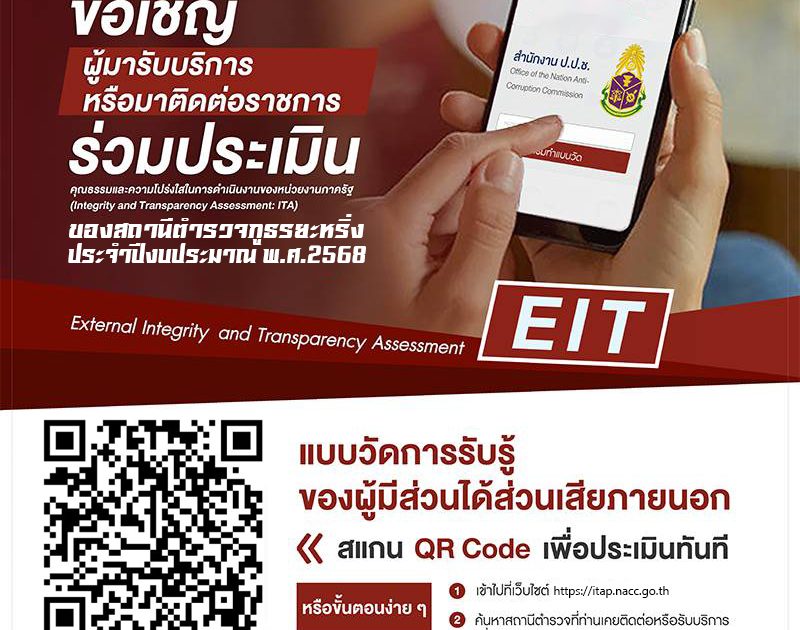 สถานีตำรวจภูธรยะหริ่ง ขอเชิญชวนผู้มารับบริการ หรือมาติดต่อราชการ ร่วมเป็นส่วนหนึ่งในการตอบแบบวัดการรับรู้ของผู้มีส่วนได้ส่วนเสียภายนอก External Integrity and Transparency Assessment (EIT) ตามโครงการการประเมินคุณธรรมและความโปร่งใสในการดำเนินงานของสถานีตำรวจ (Integrity and Transparency Assessment: ITA) ประจำปีงบประมาณ 2568 โดยสามารถเข้าไปที่เว็บไซต์ https://itap.nacc.go.th/s/F88567556 หรือ สแกน QR CODE เพื่อประเมิณ ขอบคุณทุกท่านที่ร่วมเป็นส่วนหนึ่งในการประเมินในครั้งนี้